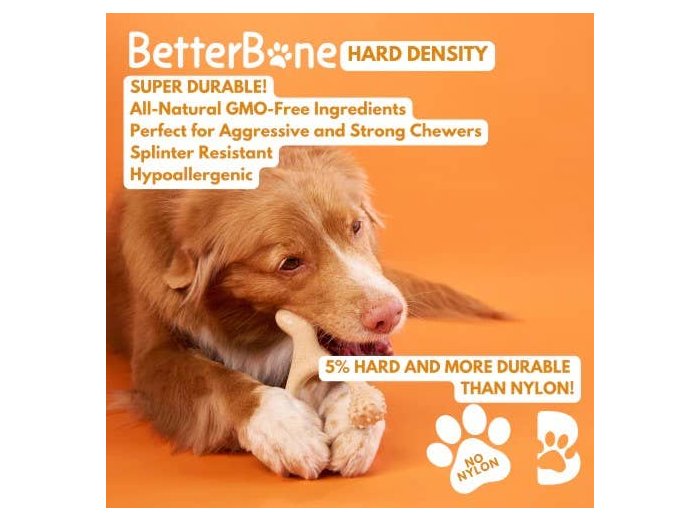 BetterBone HARD is the ultimate natural & durable chew toy for strong, tough, & aggressive chewers! Crafted from all-natural, food-grade ingredients, it is designed to promote health and dental hygiene with its super durable natural, food-grade, GMO-free ingredients. Our unique teeth-cleaning ends reach tricky, hard-to-clean areas. Pair this with our natural, non-toxic, hypoallergenic, and splinter-resistant composition. BetterBone Hard Density is perfect for strong and aggressive chewing dogs with healthy teeth. Made from two natural ingredients, our bones are healthier, safer, and delicious. The best part is, there is NO NYLON in any BetterBone. This is our large size which is recommended for large breeds (Dogs typically over 45 to 50 lbs). Our Classic flavor is hypoallergenic and really great for dogs with sensitive stomachs. Flaking is to be expected and is splinter resistant splinter.