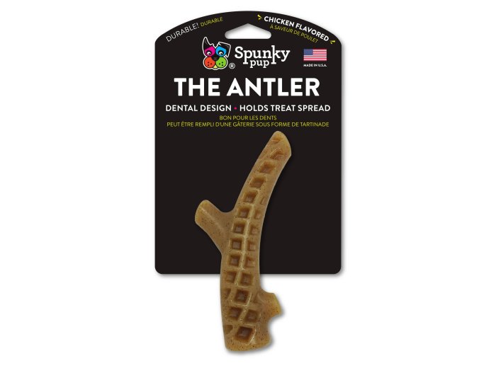 The Antlers from Spunky Pup are super-durable nylon chew toys, embedded with Chicken flavor that your dog will love. Made in the USA. Available in multiple shapes, the Antlers will keep your dog entertained for hours. Textured surface provides holds your dog's favorite peanut butter or treat spread.
