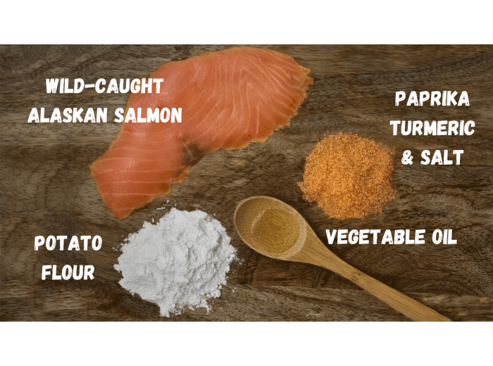 Human-grade, Wild-Caught Alaskan salmon, Potato Flour, Vegetable Oil, and our homemade seasoning of Turmeric, Salt, and Paprika.