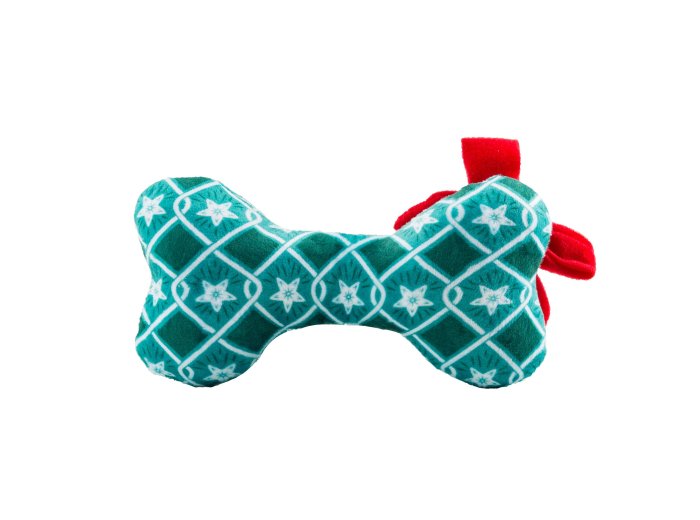 Puppermint Green Stars Bone - Happy Howlidays Bone This green and red plush toy bone is an instant howliday classic! Your merry mongrel will be grinning from ear to ear when they find what Santa left for them: the pawfect present! It features a classic shape that fits their jaws just right, a chewy plush exterior, and a hidden squeaker that rewards each bite! Bone measures 7” x 4” x 1.5” This product is individually packaged in a polybag. All Haute Diggity Dog Products include a hangtag that displays the HDD logo and UPC barcode. Imported
